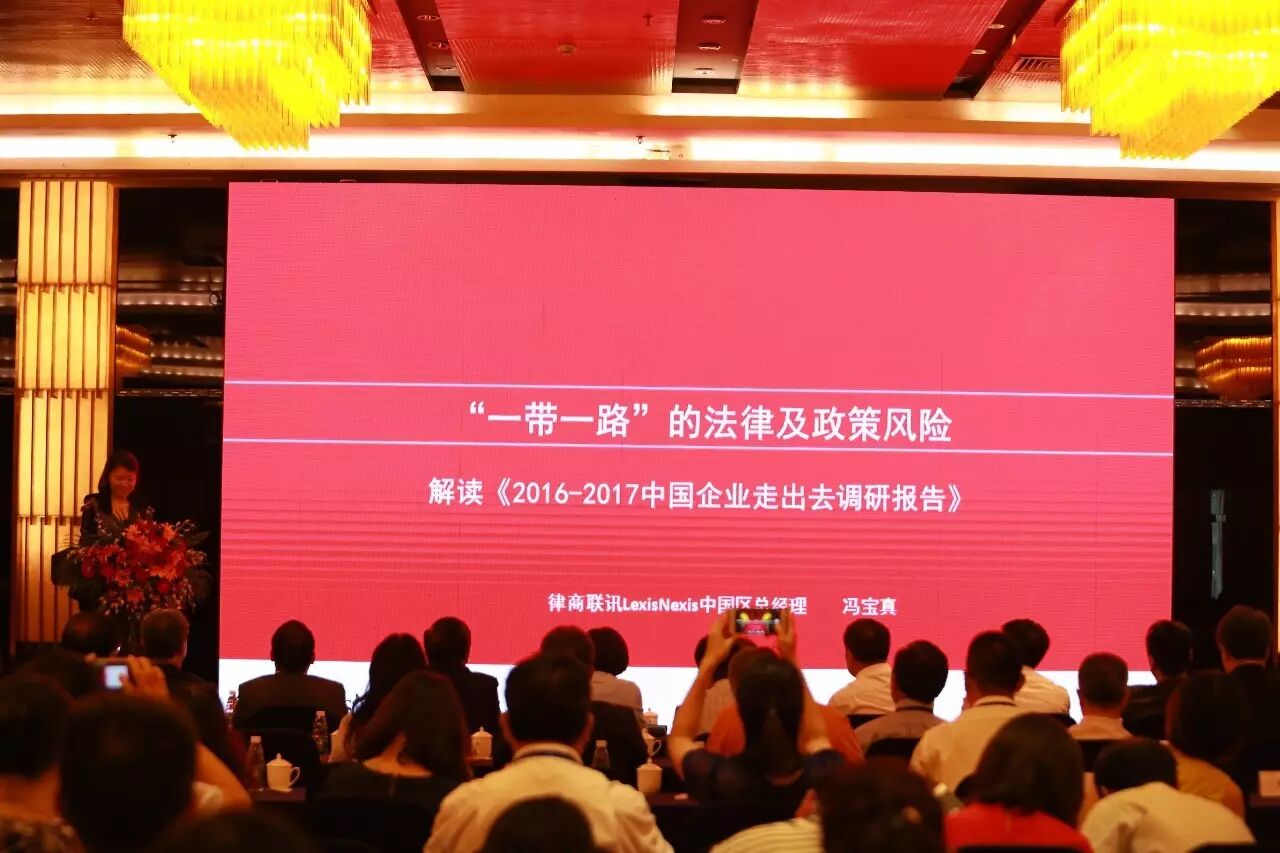 图为律商联讯中国区总经理冯宝真女士解读《2016—2017中国走出去调研报告》,阐述“一带一路”的法律及政策风险