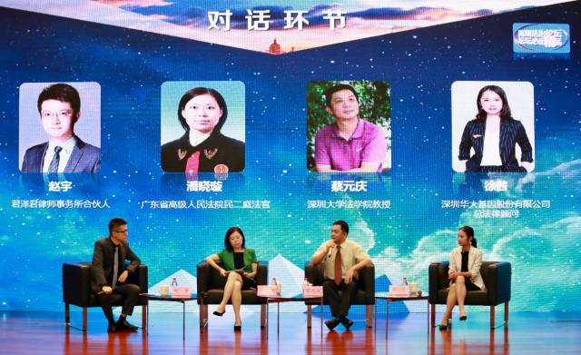 对话环节,由君泽君律师事务所合伙人赵宇主持(左一),深圳华大基因股份有限公司总法律顾问徐茜(右一)与广东省高级人民法院民二庭法官潘晓璇(左二)和深圳大学法学院教授蔡元庆(右二)就公司内部管理人的责任、公司股东的出资义务加速到期、公司法律顾问的“一票否决权”等问题展开热烈讨论,并现场回答了观众提出的具体实践问题。