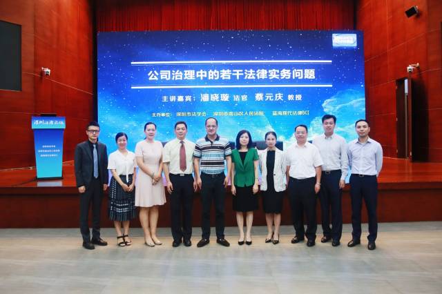 主办方与嘉宾合影:左起君泽君律师事务所合伙人赵宇,蓝海中心理事长李茁英,深圳大学法学院副教授宋明、深圳大学法学院教授蔡元庆,深圳市南山区人民法院党组书记、院长詹旭伟,广东省高级人民法院民二庭法官潘晓璇,深圳华大基因股份有限公司总法律顾问徐茜,深圳市南山区人民法院党组成员、政治处主任童武,蓝海中心副理事长李磊明,蓝海中心副理事长李壮鸿